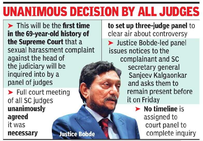 Appointment of the inquiry panel also comprising Justices NV Ramana and Indira Banerjee was ratified by the full court meeting - a deliberation of all SC judges. The Justice Bobde-led panel on Tuesday issued notices to the complainant and SC secretary general Sanjeev Kalgaonkar and asked them to be present before it on Friday, the first hearing on the complaint.
